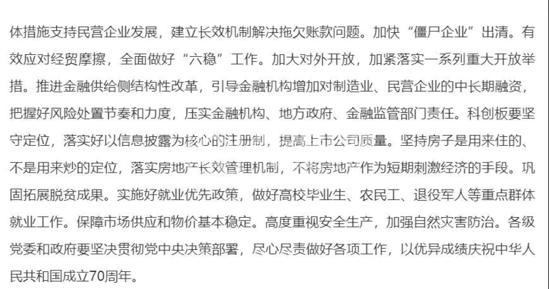 9、加紧落实一系列重大开放举措(一般来说,讲“加紧”比“加快”更急。虽然对贸易战只提了有效应对,但开放其实也是用来对冲贸易战的);