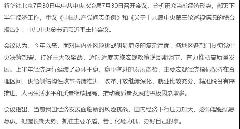 7月30日,中共中央政治局召开会议,分析研究当前经济形势,部署下半年经济工作,释放了重要信号。小编稍作整理,分享下主要情况: