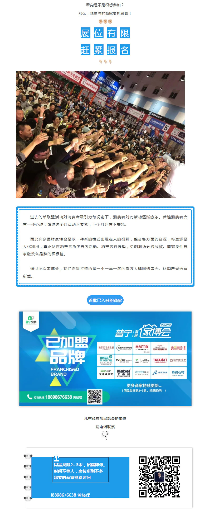 普宁首届家博会,为商家与装修业主搭建一站式采购平台,本次还有三人禾高端营销的第三方全程执行,为商家摆脱销售困境,快速提升营业额。普宁首届家博会也将与商家同心协力,创造更多奇迹!