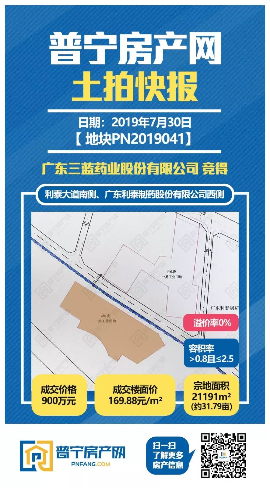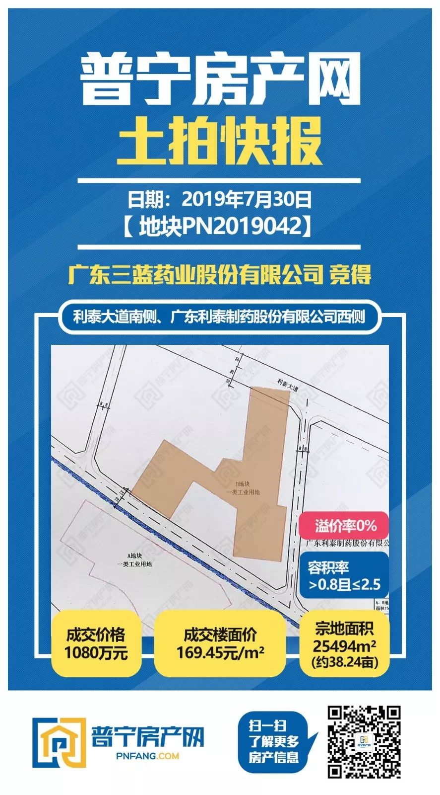 PN2019040地块只一轮流以9050万元被普宁市翔栩房地产开发有限公司拍下,楼面价1248.36元/m²,溢价率为12.1%。