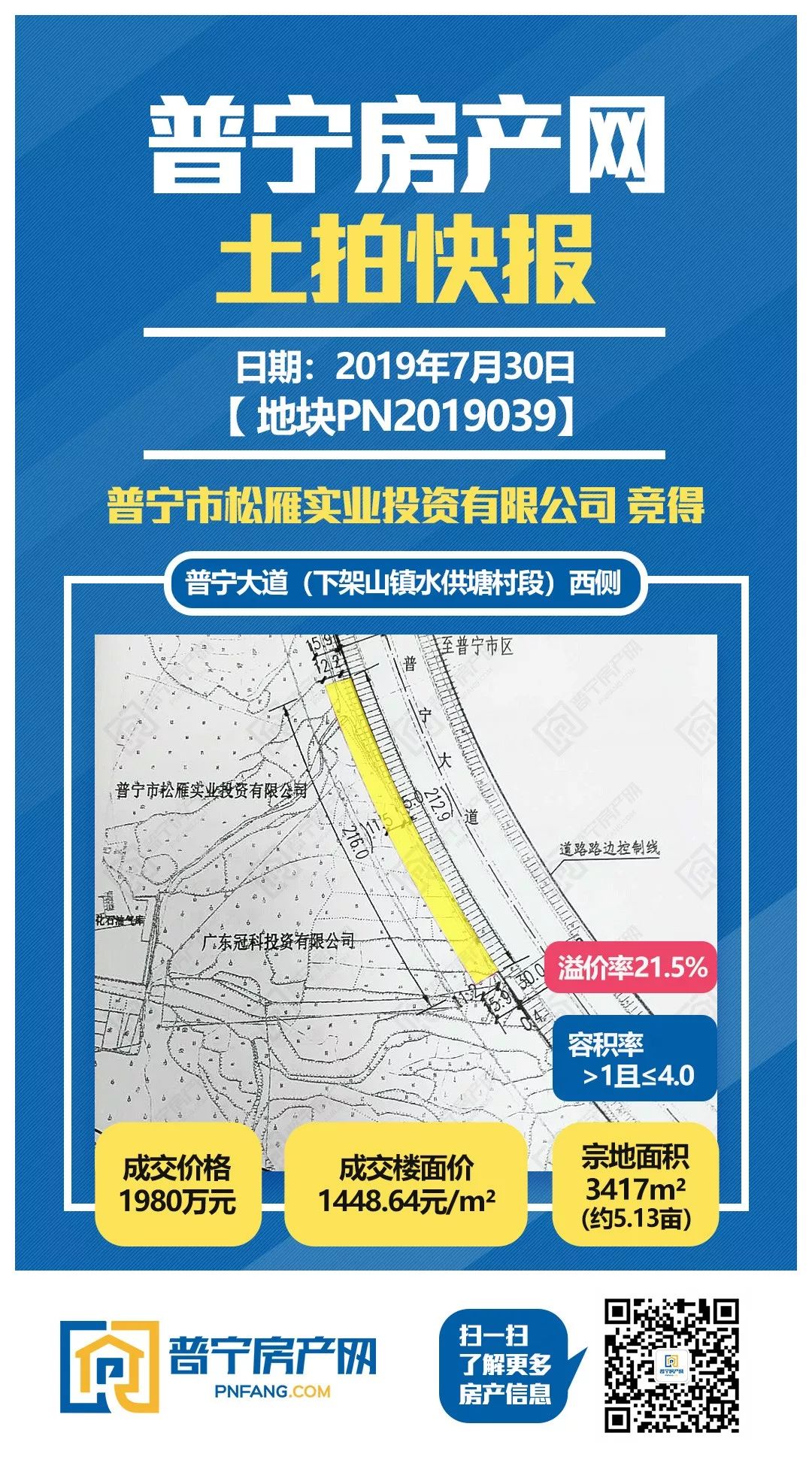 PN2019039地块只一轮流以1980万元被普宁市松雁实业投资有限公司拍下,楼面价1448.64元/m²,溢价率为21.4%。