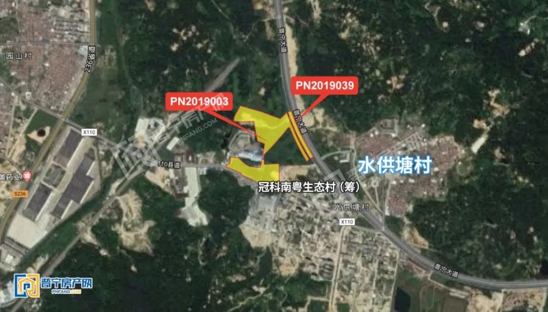 值得注意的是,今年3月28日,普宁市松雁实业投资有限公司曾以19100万元拍下位于下架山镇水供塘村(普宁大道南侧)地块(相关链接:57亩!1.91亿元成交!2019年普宁首宗宅地今成功出让!),与今天土拍竟得的PN2019039地块恰好紧密相连。