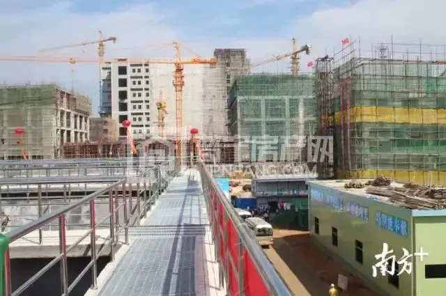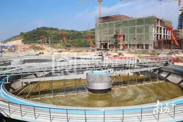 污水处理厂内,卡车进进出出,塔吊作业繁忙
