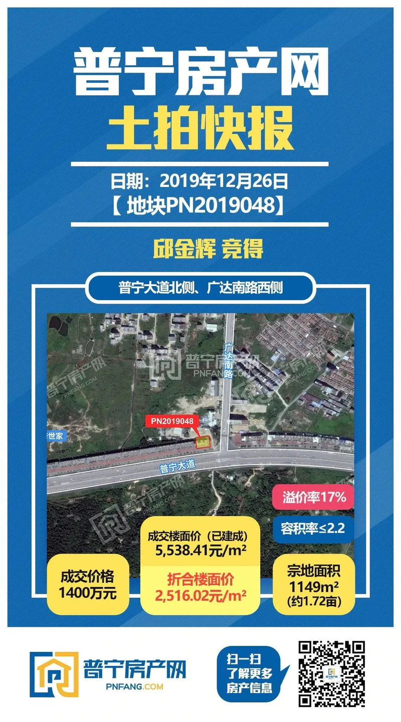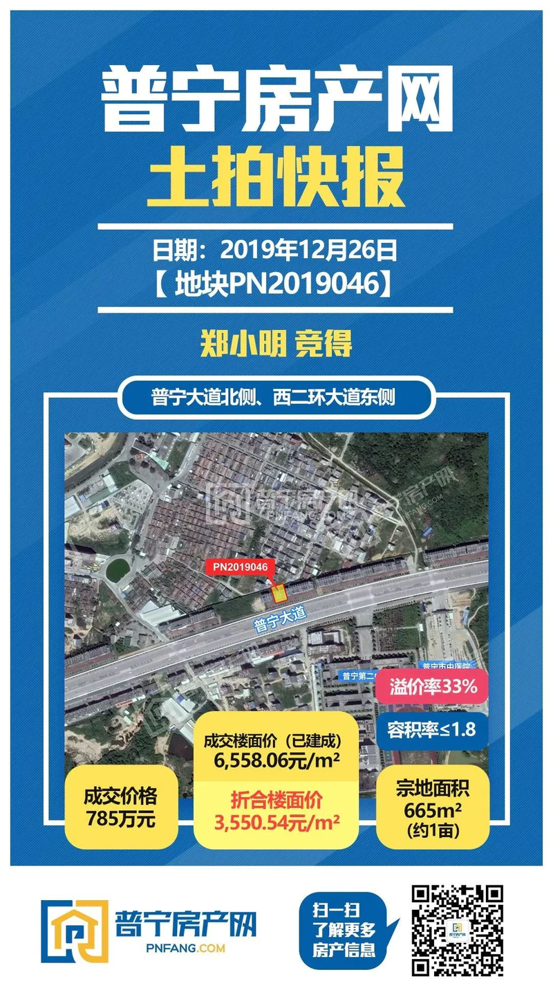 PN2019046地块以785万元被郑小明拍下,成交价6558.06元/m²,折合楼面价3550.54元/m²,溢价率为33%。该地块一二层作为商业经营场地,土地出让年限40年,三层及以上作为住宅用地,土地出让年限70年,该宗地成交后,房地产一并移交。 PN2019047地块竞争最为激烈,经过十轮竞价最终以5080万元被普宁市金裕实业投资有限公司拍下,成交价5877.04元/m²,折合楼面价2866.79元/m²,溢价率为22%。该地块一二层作为商业经营场地,土地出让年限40年,三层及以上作为住宅用地,土地出让年限70年,该宗地成交后,房地产一并移交。 PN2019048地块以1400万元被邱金辉拍下,成交价5538.41元/m²,折合楼面价2516.02元/m²,溢价率为17%。该地块一二层作为商业经营场地,土地出让年限40年,三层及以上作为住宅用地,土地出让年限70年,该宗地成交后,房地产一并移交。 PN2019049地块虽经过2轮竞拍,最后还是以流拍结束。 据了解,普宁大道是普宁的大动脉,对接市区各主要干道,始于国道324线(普惠高速池尾(楼盘详情户型图相册地图)出入口),最终在汕头市潮南区陈店镇与陈沙公路相接,沿途有普宁市第二中学、普宁市中医院、康美普宁中药城、普宁高铁站等重大配套项目。 本次出让的四宗地块均位于普宁大道,其中PN2019046、PN2019047、PN2019048地块均位于商业街,值得注意的是,三宗地块成交楼面价较高,主要是三宗用地均已建成,楼面价包含地面上建筑,实际楼面价应减去地面上建筑的成本。 PN2019049地块与此前被普宁市松雁实业投资有限公司拍下的PN2019003地块和PN2019039地块均位于水供塘村一带,周边的楼盘集中有帝景城、翔栩水岸城、盛迪嘉中心•光明印象组团、盛迪嘉中心•光明传奇组团、港泰豪庭(楼盘详情户型图相册地图0663-2559559)等项目,相信此地段未来发展前景大为可观。