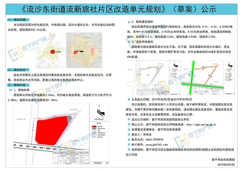 22日,《普宁市梅林镇粮食管理所地块单元规划》(草案)公示,规划总用地面积约26.85亩,将定位为:公告设施齐全,布局完整,环境较好的居住小区。24日,《广东名鼠股份有限公司规划设计条件调整论证报告》批后公示,规划面积63.44亩。29日,《普宁市丽达纺织有限公司旧厂房改造单元规划》(草案)公示,规划用地面积约218.07亩,将定位为以居住为主,兼有商业的旧厂房改造示范片区。1日,《洪阳镇和安片区控制性详细规划》(草案)公示,规划范围为478.8亩,将建成集农产品交易、花卉购物等功能的综合宜商、宜居小区。5日,《揭阳市普宁市青梅产业园控制性详细规划》(草案)公示,规划建设用地规模为1813.05亩,将打造集青梅加工生产、技术研发、旅游观光为一体的现代产业园。22日,流沙东街道新安片区旧区“三旧”改造首期项目改造方案公示,项目总占地面积约225亩,该项目改造预计2020年10月开工,工期3年,计划2023年10月竣工。22日,《普宁白坑湖县级湿地公园总体规划(2019-2023年)》公示,规划总投资4762.82万元,将建成粤东地区知名的湿地公园。25日,《流沙东街道大林社区(楼盘详情户型图相册地图)三旧改造单元规划》(草案)公示,规划范围167.1亩,将建设成公共设施齐全,布局完整的三旧改造居住小区。28日,盛迪嘉中心三批次盛大开盘