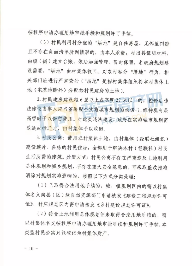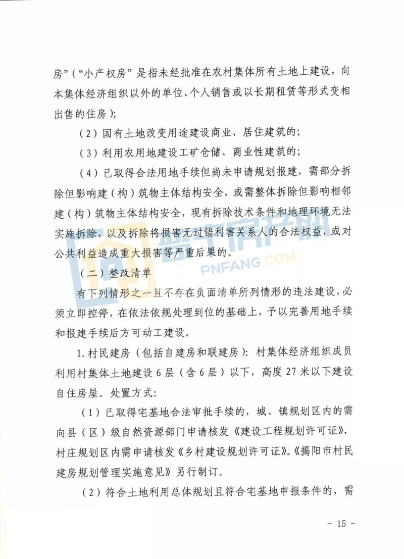 1. 村民建房(包括自建房和联建房):村集体经济组织成员利用村集体土地建设6层(含6层)以下,高度27米以下建自住房屋。处置方式: