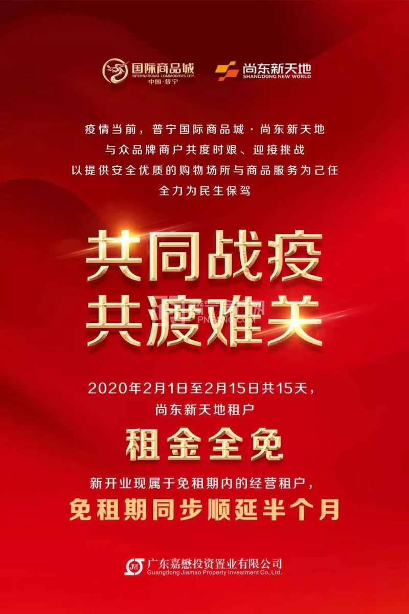 普宁国际商品城与所有租户风雨同舟,以提供安全优质的购物场所与商品服务为己任,保证为家超市营业时间,竭尽全力补足货源,稳定价格,保障民生物资供应。同时为入驻租户减负让利,给予商户租金减免优惠条件:尚东新天地(楼盘详情户型图相册地图0663-2559559)所有租户2020年2月1日至2020年2月15日共15天租金全免,新开业现属于免租期内的经营租户,免租期同步顺延半个月,该举措受到广大商户的一致好评。