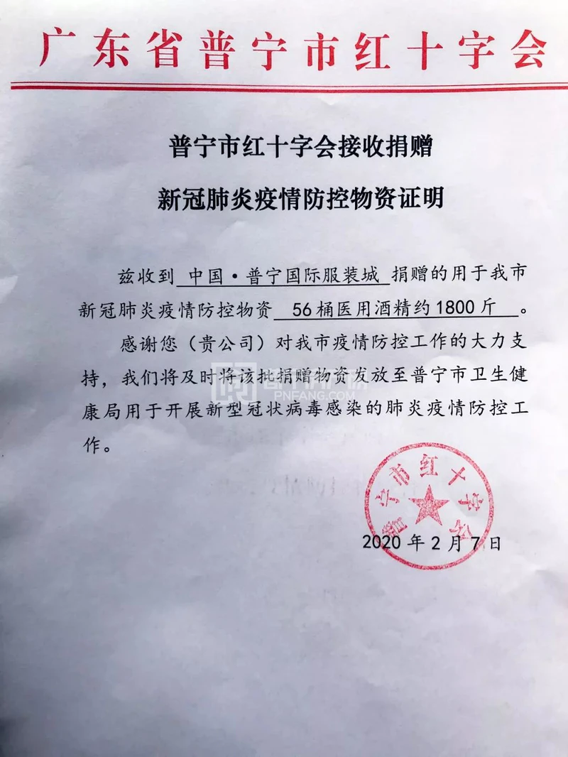 在新冠肺炎疫情防控阻击战中,中国·普宁国际服装城认真按照市委、市政府的部署,除积极做好市场的宣传教育、卫生消毒、进出人员测量体温之外,还积极开展暖心活动。继本月决定对服装城3000多商户减少半个月租金之外,2月7日又向普宁市红十字会捐赠医用酒精56桶1800斤。市红十字会负责人对服装城的爱心善举表示赞赏!表示将及时将这批捐赠物资发放至普宁市卫生健康局用于新冠肺炎疫情防控工作。 ▍来源:普宁服饰报 ▍编辑:普宁房产网(楼盘详情户型图相册地图) ▍转载请注明出处 ▍如有侵权,请联系小编删除
