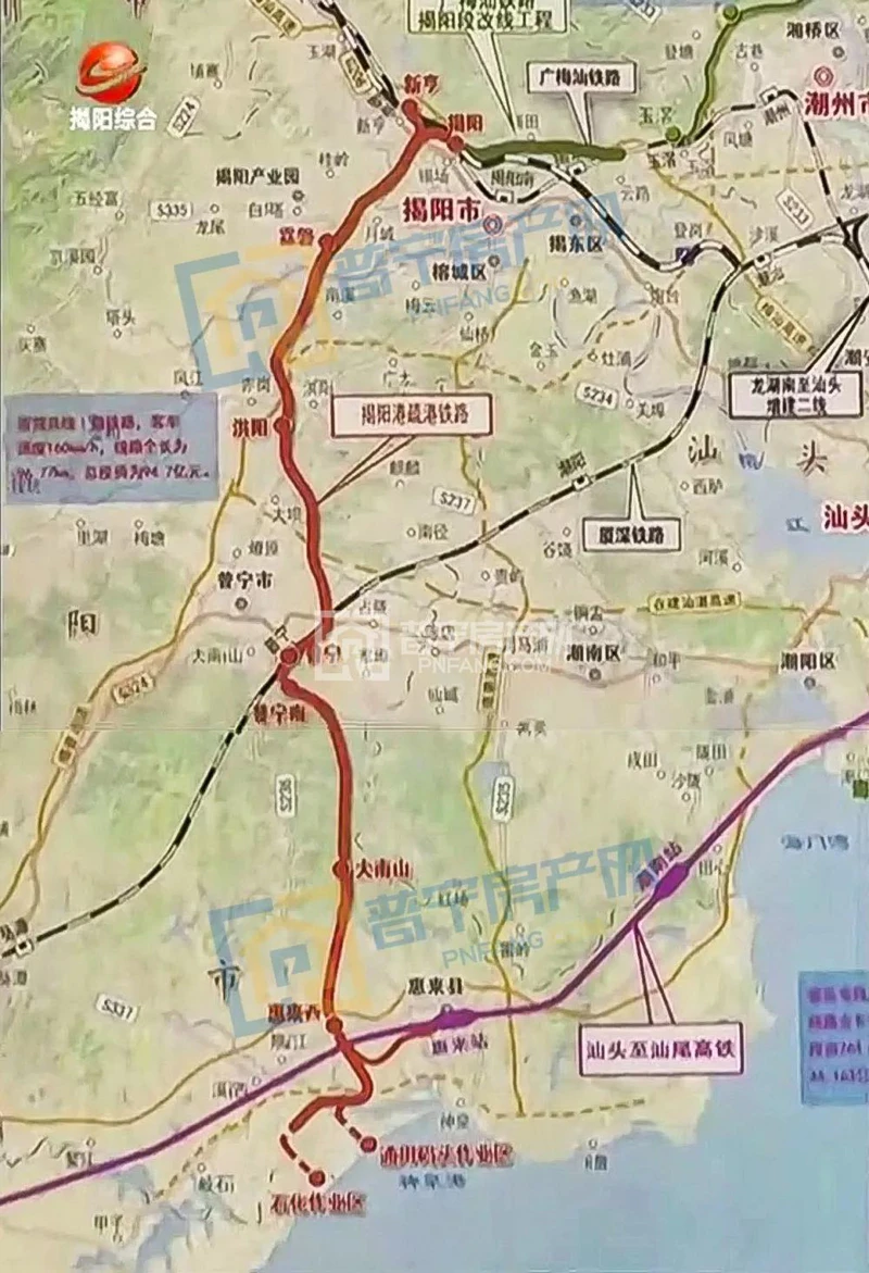 新建揭阳港疏港铁路位于广东省东南部,线路自广梅汕铁路新亨站引出经揭东区、蓝城区、普宁市、惠来县至大南海石化工业区,线路全长约96.7km。