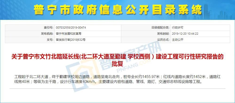 近日,小房君从普宁市发展改革局了解到,普宁市文竹北路延长线(北二环大道至勤建学校西侧)建设工程可行性研究报告获批复,北二环片区将新建一条主干路。
