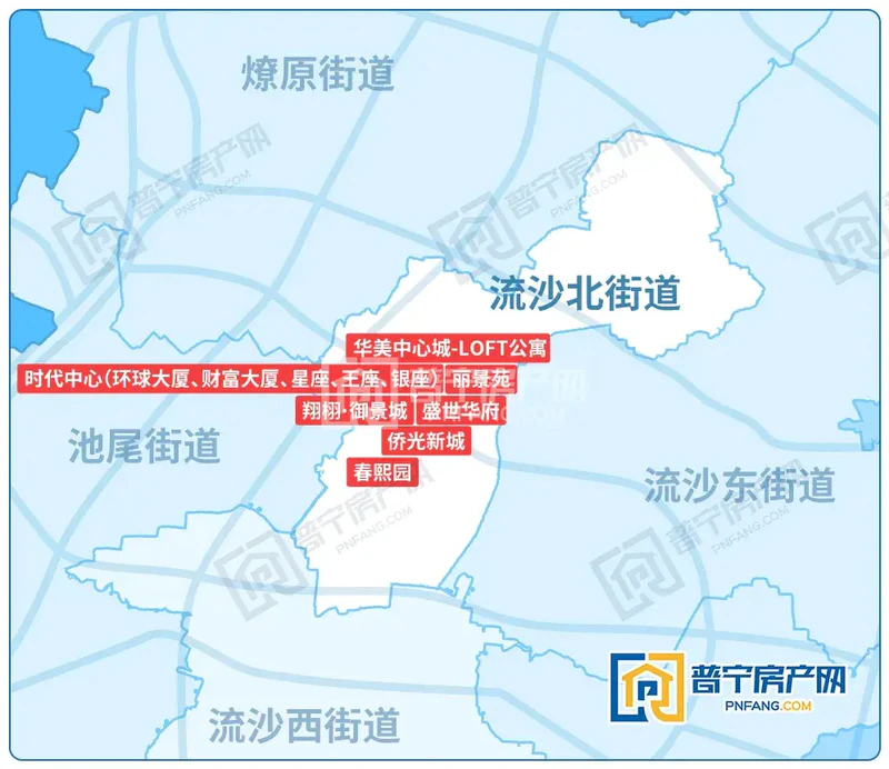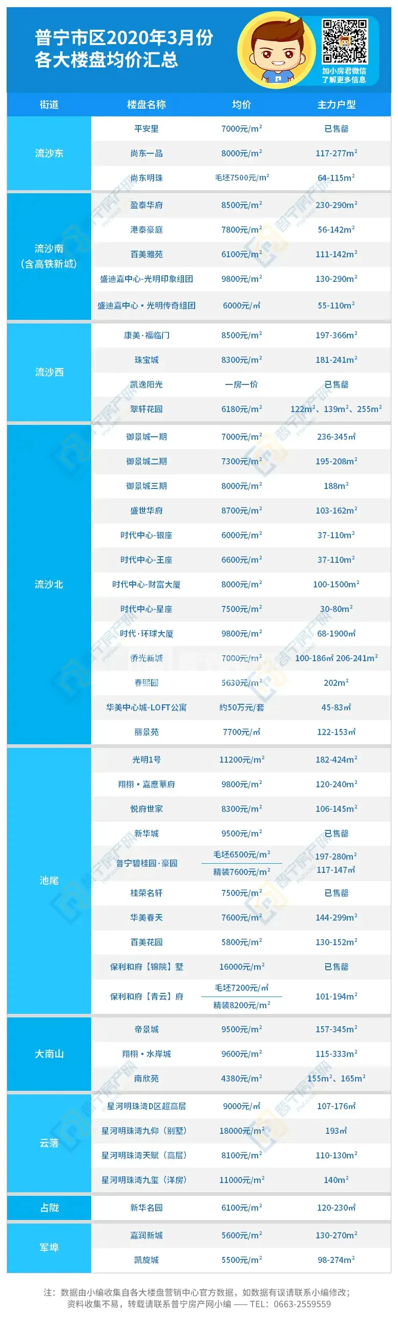 那么经过这次疫情 普宁市区3月份各楼盘均价情况如何呢? 今天就跟着小房君一起来看下 为方便大家查询房价 小编贴心的为大家提供查询入口 发送【均价】即可查询最新房价信息 对普宁楼市感兴趣的小伙伴可以加群讨论 加小房君微信,拉你入群,共商大计 普宁市区2020年 3月份各大楼盘均价表 楼盘分布图 流沙东街道 流沙东街道目前有三个楼盘,其中平安里(楼盘详情户型图相册地图)是已经售罄的,尚东一品(楼盘详情户型图相册地图0663-2559559)和尚东明珠(楼盘详情户型图相册地图0663-2559559)均位于商品城,周边配套有美佳乐购物中心,尚东步行街,东埔铁山兰综合市场等。 流沙南街道 流沙南街道目前有四个楼盘,其中百美雅苑(楼盘详情户型图相册地图)位于泗竹埔(楼盘详情户型图相册地图),均价是最低的,6100元/㎡,其次是港泰豪庭(楼盘详情户型图相册地图0663-2559559)和盈泰华府(楼盘详情户型图相册地图0663-2559559)、盛迪嘉中心均位于高铁站附近,交通便利。 流沙西街道 目前流沙西街道有四个楼盘,除了翠轩花园(楼盘详情户型图相册地图)均价较低,6180元/㎡,珠宝城和康美福临门均价分别为8300元/㎡和8500元/㎡,而凯逸阳光(楼盘详情户型图相册地图)是一房一价,已经售罄了。 流沙北街道 目前流沙北街道有7个楼盘,时代中心是可办公可投资,御景城和华美中心城主要位于普宁广场区域,周边配套有万泰汇购物中心,星河Coco city购物中心,交通便利。而春熙园(楼盘详情户型图相册地图)是均价最低的,5630元/㎡,只剩下大户型,刚需的小伙伴们可以看侨光新城(楼盘详情户型图相册地图),盛世华府(楼盘详情户型图相册地图0663-2559559),丽景苑,对于想住进离市中心不远的资金又不多的人来说也不失为一个机会。 池尾街道 云落镇 占陇镇 军埠镇 看完这些数据 还没买房的你 2020年准备在普宁买房了吗? 普宁整体还是以稳房价为主,房住不炒, 所以对于刚需购房者来说, 买房应该要趁早! 一定要把握好上车时机!