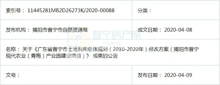 今天,普宁市自然资源局发布了关于《广东省普宁市土地利用总体规划(2010-2020年)修改方案(揭阳市普宁现代农业(青梅)产业园建设项目)》成果的公告。《方案》已于2020年4月1日通过广东省人民政府批准(粤府土审(01)[2020]42号)。根据相关法律、法规要求,现将《方案》成果向社会公告。