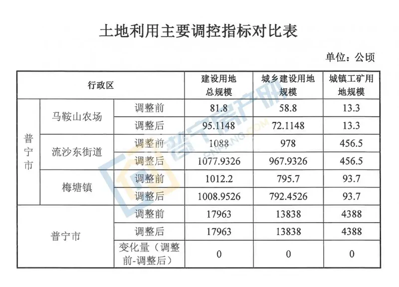 规划修改过程中,调入地块规划用途由农用地和其他土地调整为城乡建设用地;调出地块规划用途由城乡建设用地调整为农用地,以保持普宁市建设用地规模平衡。本项目涉及的调入调出地块面积均为13. 3148公顷,规划修改后,普宁市规划农用地面积增加0. 7438公顷,其中耕地面积增加8. 8656公顷,园地面积减少 10. 8899公顷,林地面积减少 0. 9974公顷,其他农用地面积增加3. 7655公顷;建设用地面积保持不变,城乡建设用地面积保持不变;其他土地面积减少0. 7438公顷。根据现行规划,普宁市目标年(2020年)各项主要调控指标为:耕地保有量不低于21837公顷,基本农田保护面积不低于 18532公顷,建设用地总规模控制在17963公顷以内,城乡建设用地规模控制在13838公顷以内。调整后,普宁市的耕地保有量、基本农田保护面积、建设用地总规模和城乡建设用地规模等各项指标均保持不变。