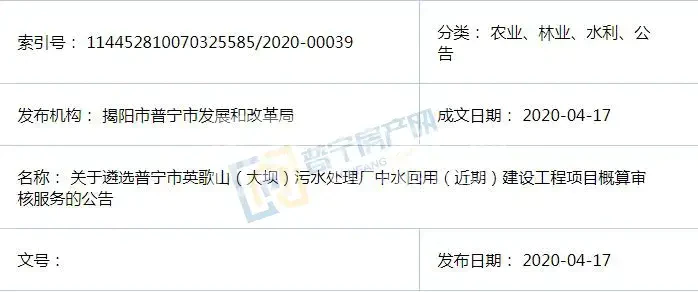 近日,小房君了解到,为加快我市污水处理设施建设进度,推动练江综合整治工作,有效解决中水回用问题,普宁市发展和改革局决定组织审核《普宁市英歌山(大坝)污水处理厂中水回用(近期)建设工程项目》的概算。为保证概算质量,特向社会遴选高水平的工程造价咨询企业。具体如下: