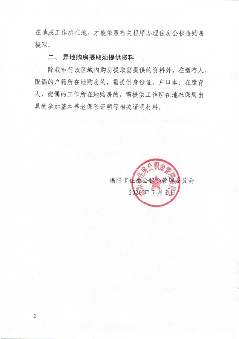为进一步贯彻落实《广东省住房和城乡建设厅 广东省财政厅 广东省公安厅 中国人民银行广州分行转发住房城乡建设部等四部门关于开展治理违规提取住房公积金作的通知》(粤建金〔2018〕115号)文件精神,坚持“房子是用来住的,不是用来炒的”定位,维护住房公积金正常管理秩序,结合我市实际,现就规范我市住房公积金异地购房提取业务有关事项通知如下:对于缴存人及其配偶在本市行政区域外购买自住住房提取住房公积金的,房屋地址应当在缴存人、配偶的户籍所在地或工作所在地,才能依照有关程序办理住房公积金购房提取。除我市行政区域内购房提取需提供的资料外,在缴存人、配偶的户籍所在地购房的,需提供身份证、户口本;在缴存人、配偶的工作所在地购房的,需提供工作所在地社保局出具的参加基本养老保险证明等相关证明材料。