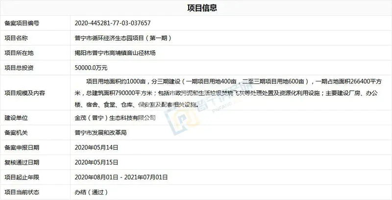 据小房君了解,普宁市循环经济生态园项目(第一期)已于5月通过备案。项目位于普宁市高埔镇音山径林场,总投资50000万元,由金茂(普宁)生态科技有限公司建设,项目分三期建设,一期占地面积266400平方米,总建筑面积790000平方米;包括市政污泥和生活垃圾焚烧飞灰等处理处置及资源化利用设施;主要建设厂房、办公楼、宿舍、食堂、仓库、保安室及配套相关设施。