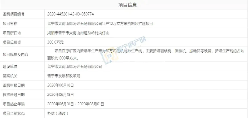施工期3个月!普宁这个年产10万m³机制砂扩建项目备案通过!