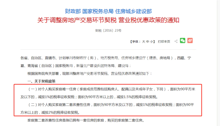 而目前我们买房需要征收的1-1.5%的契税,其实是根据《财政部 国家税务总局 住房城乡建设部关于调整房地产交易环节契税 营业税优惠政策的通知》中的相关减免政策。
