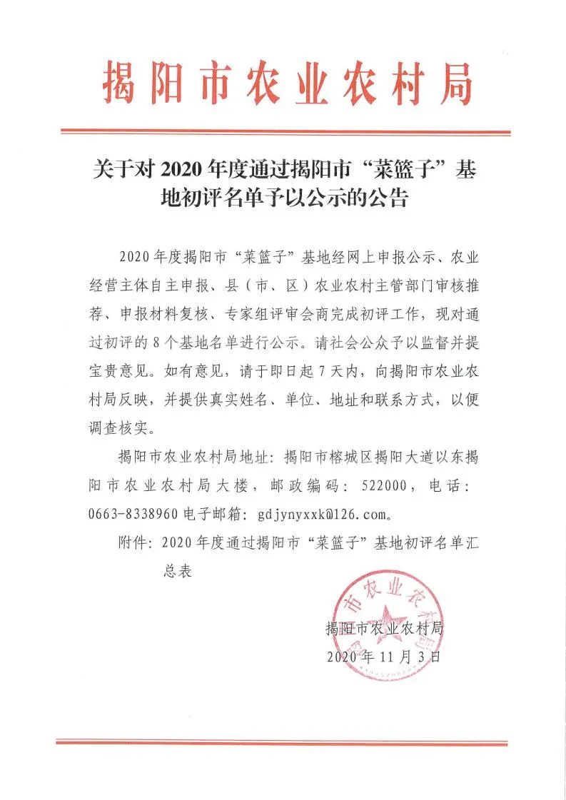 近日,广东省农业农村厅发布了关于公示广东省“菜篮子”基地名单的公告。普宁共有3个基地上榜,其中2家单位入选省“菜篮子”基地初评拟通过名单,1家单位入选复审拟通过名单。