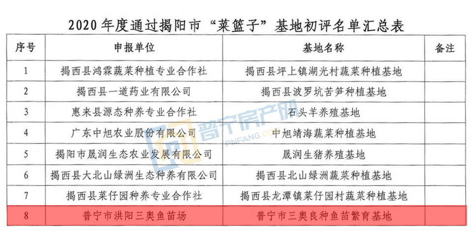 据小房君了解,近日揭阳市农业农村局也发布了关于对2020年度通过揭阳市“菜篮子”基地初评名单予以公示的公告,共有8个基地通过初评。其中,普宁市洪阳三奥鱼苗场申报的普宁市三奥良种鱼苗繁育基地榜上有名。
