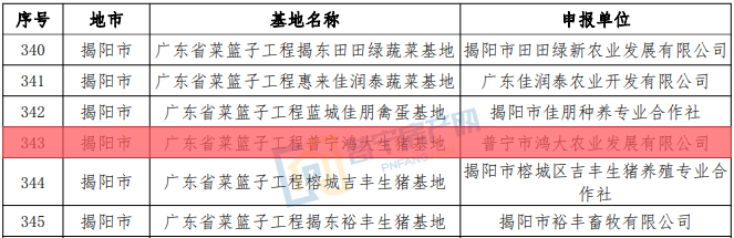 省“菜篮子”基地复审拟通过名单共354个,其中普宁1个,广东省菜篮子工程普宁鸿大生猪基地。
