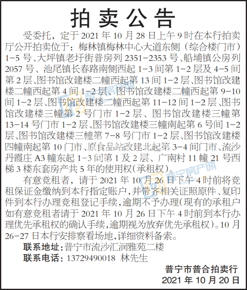 有意竞租者,请于2021年10月26日下午4时前将竞租保证金缴纳到本行指定账户,并带齐相关证照原件、复印件到本行办理竞租登记手续,逾期不予办理(现有的承租户如有意竞租者请于2021年10月26日下午4时前到本行办理优先承租权的确认手续,逾期视为放弃优先承租权)。10月26-27日本行安排察看场地,详细资料备索。