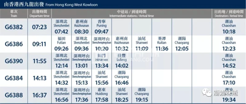9月23日广深港高铁香港段通车当天,第一班车将于7时由香港西九龙站发出,到达深圳北站。广深港高铁途经广州、东莞、深圳、香港,并借由国家高速铁路网,连接全国44个高铁站点(38个长途站点和6个短途站点),其中就包括潮汕(普宁站,潮阳站,潮汕站)。