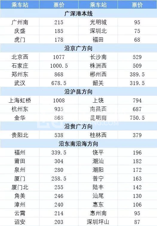 内地主要车站至香港西九龙