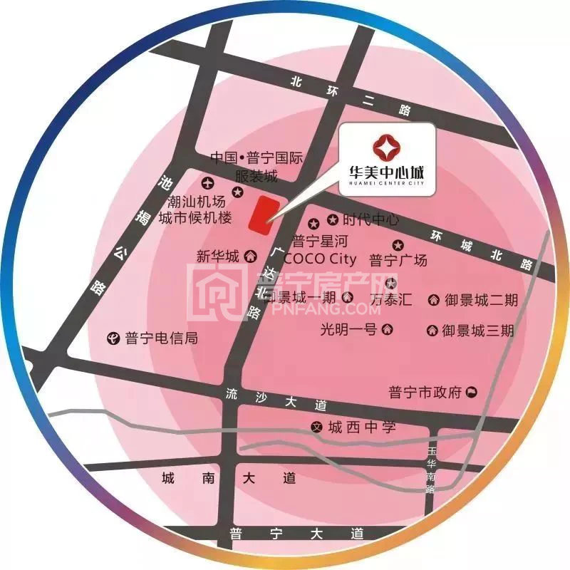 华美中心城由广东超亿美投资有限公司高标准规划、大手笔投资的大型综合性项目,坐落于环市北路与广达北路黄金交叉点,毗邻中国·普宁国际服装城一期,正对时代中心(普宁星河COCO City,沃尔玛)、周边聚集普宁广场、万泰汇、新华城(楼盘详情户型图相册地图0663-2559559)、御景城等人流汇集项目,商圈效应辐射整个大粤东,是普宁城市发展的新轴心。