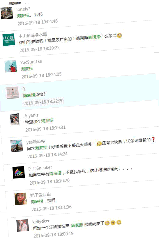 @卑劣的鳌拜:上次一个人吃海底捞,服务员走过来给我涮菜递水聊天,从人生抱负谈到明星八卦,硬生生吃了90分钟我才走人的,送我时还说欢迎下次光临,记得还要点我哦……