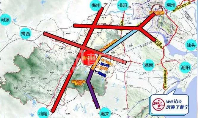 对普宁来说,"国道G238线"、"普宁-空港高速连接线汕湛高速普宁段"的建设,将打造以普宁市区为中心,【北上】有通往空港区、潮汕机场、揭阳市区、潮州市的快速通道;【南下】有通往惠来副中心、大南海工业区的快速通道;【左西】有通往揭西、河源的快速通道;【右东】有通往潮南、潮阳、濠江、汕头市区的快速通道。