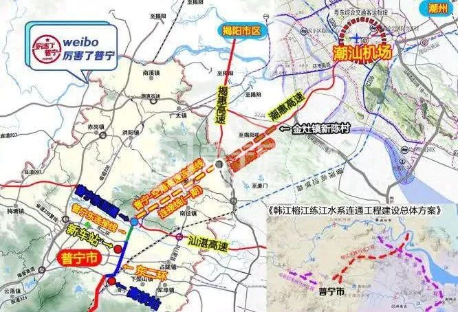 建议: 争取建设普宁-空港高速连接线,在汕湛高速普宁段的普宁东互通为起点,沿占南路,跨省道237线和县道110线,与揭惠高速建立互通立交(设为一期工程),最后接入潮惠高速潮阳金灶镇新陈村(二期工程)。建议项目走向大致与《韩江榕江练江水系连通工程建设总体方案》榕江关埠引水工程方向一致。