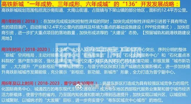建议:加快新区开发建设,挂名“普东新区(高铁新城),打造以“高铁新城为起步区”的普东新区,积极实施“一年成势、三年成形、六年成城”的“136" 开发发展战略,以“高铁枢纽”为产业引擎,以"普宁新门户、城市新家园、产业新高地”为发展定位,以“区域服务总部基地、石化金融服务中心、枢纽型商业旅游服务中心、石化科研培训基地、商务外包服务基地、创智文化交流中心”为功能驱动,全力打造“具有潮汕风格的现代都市城区、枢纽型高端服务业态区、低碳生态可持续示范区”。