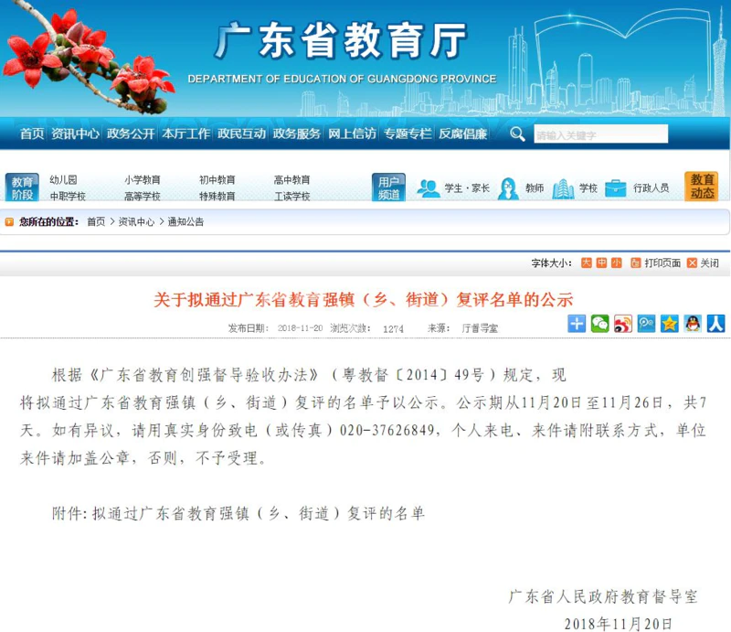 根据《广东省教育创强督导验收办法》(粤教督〔2014〕49号)规定,现将拟通过广东省教育强镇(乡、街道)复评的名单予以公示。公示期从11月20日至11月26日,共7天。如有异议,请用真实身份致电(或传真)020-37626849,个人来电、来件请附联系方式,单位来件请加盖公章,否则,不予受理。