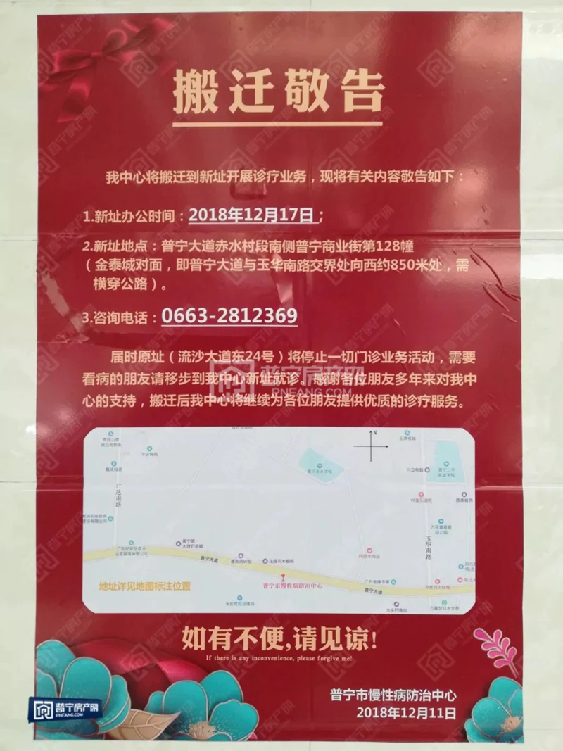 近日,小编从普宁市慢性病防治中心了解到,该中心将于12月17日在普宁大道赤水村段南侧开展办公,届时原址将停止一切门诊活动。