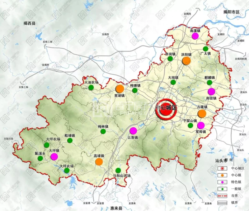 构建“中心城区-中心镇-特色镇-一般镇”四级城镇等级体系。其中,中心镇包括洪阳镇、占陇镇、里湖镇、高埔镇,特色镇包括军埠镇、云落镇、南径镇、大坪镇、南溪镇,一般镇包括下架山镇、赤岗镇、大坝镇、麒麟镇、广太镇、梅塘镇、船埔镇、梅林镇、后溪乡、大坪农场、马鞍山农场、大池农场。
