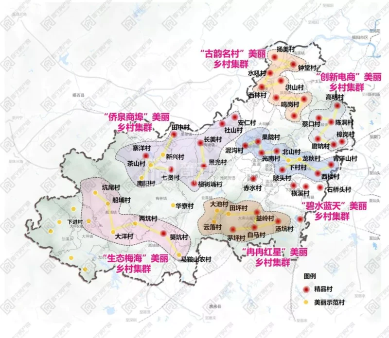打造一批村容整洁、特色突出的“美丽乡村”,包括“生态梅海”美丽乡村集群、“侨泉商埠”美丽乡村集群、“古韵名村”美丽乡村集群、“创新电商”美丽乡村集群、“碧水蓝天”美丽乡村集群、“冉冉红星”美丽村庄集群等。