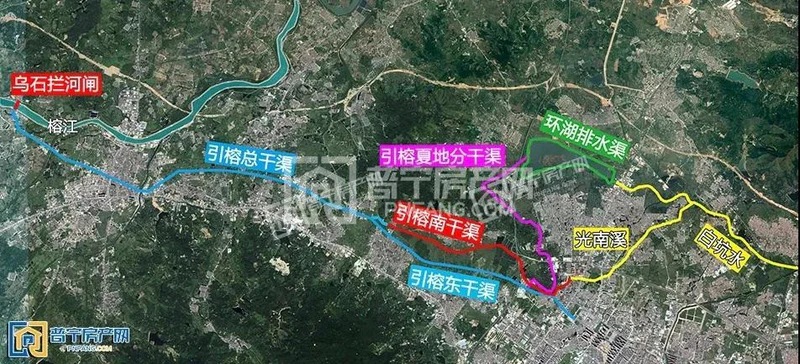 乌石拦河闸引水工程作为韩江榕江练江水系连通工程的子工程之一,属于重大公共、基础设施项目。工程总投资11400.47万元。工程以榕江南河为取水水源地,取水口乌石引水闸位于乌石拦河闸上游,利用引榕灌区的干渠作为引水通道,在满足设计灌溉任务后的过流余度自流引水至练江。引榕灌区于1956年建成,是普宁市的重点灌区,灌区总干渠总设计引水规模为12m3/s,沿线分北干渠、南干渠和东干渠。乌石拦河闸引水工程分别利用灌区中的南干渠交水入光南溪、东干渠和夏地分干渠交水入白坑水,引水线路如下: