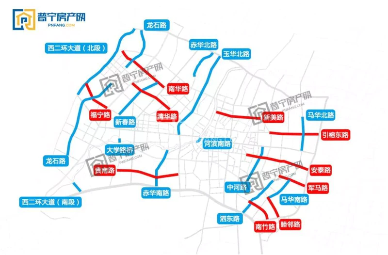 西二环大道作为城市主干道,南段工程也早已建成通车,北段目前也尚未启动,且与揭普高速平行,交通改善需求并无中心城区的迫切;龙石路是贯穿普宁市科技园的重要道路,是池尾(楼盘详情户型图相册地图)街道城市开发的重要道路之一,目前也尚未完工;福宁路作为于大学路相交的辅路,对缓解城西大道车流问题也有一定的推动作用。
