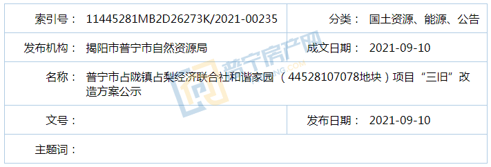 根据普宁市“三旧”改造方案审批流程,为更好地接受社会和社区居民的监督,今天普宁市自然资源局将普宁市占陇镇占梨经济联合社和谐家园(44528107078地块)项目“三旧”改造方案进行公示,征求公众意见。