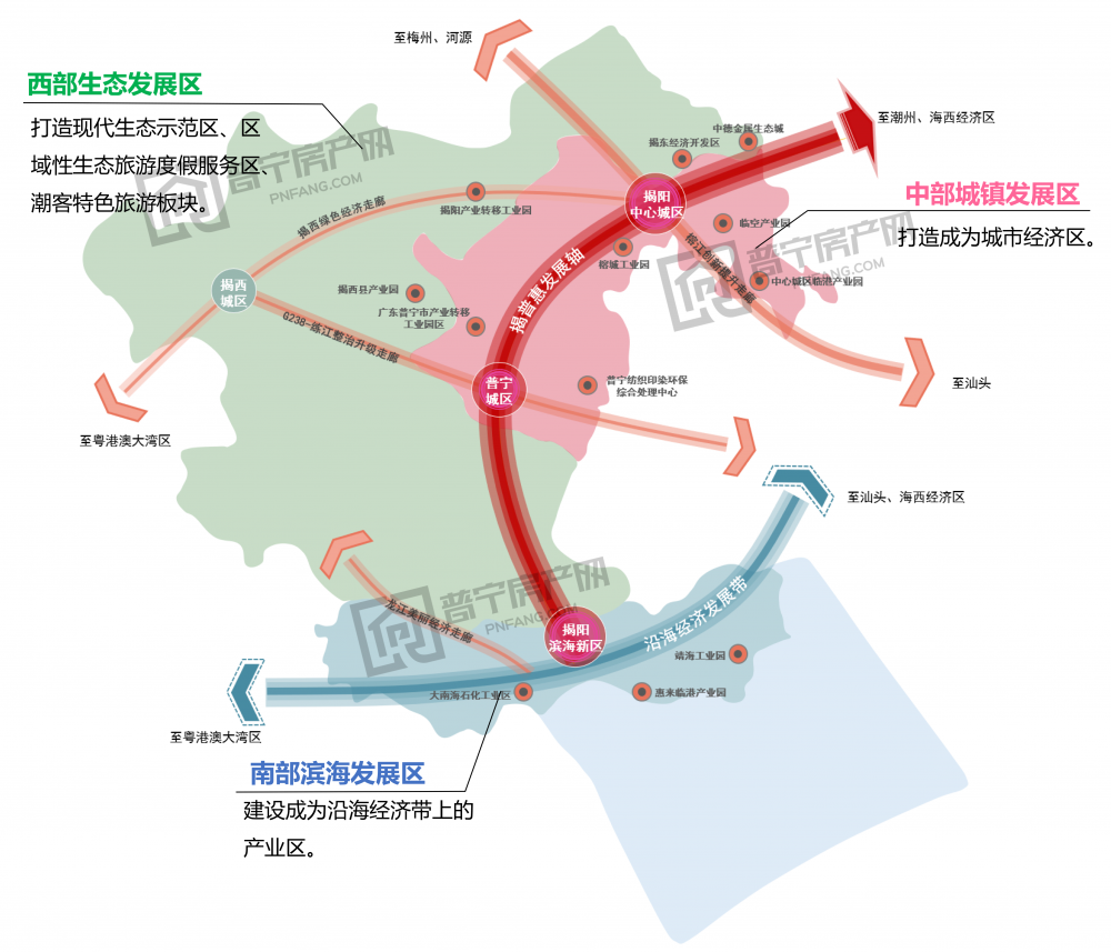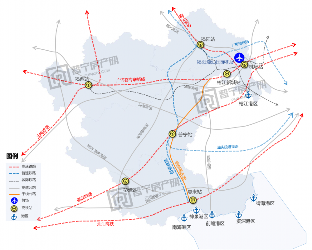 规划新增普宁通用机场,规划建设揭惠铁路等货运铁路,规划新增揭普惠快速通道等干线道路。