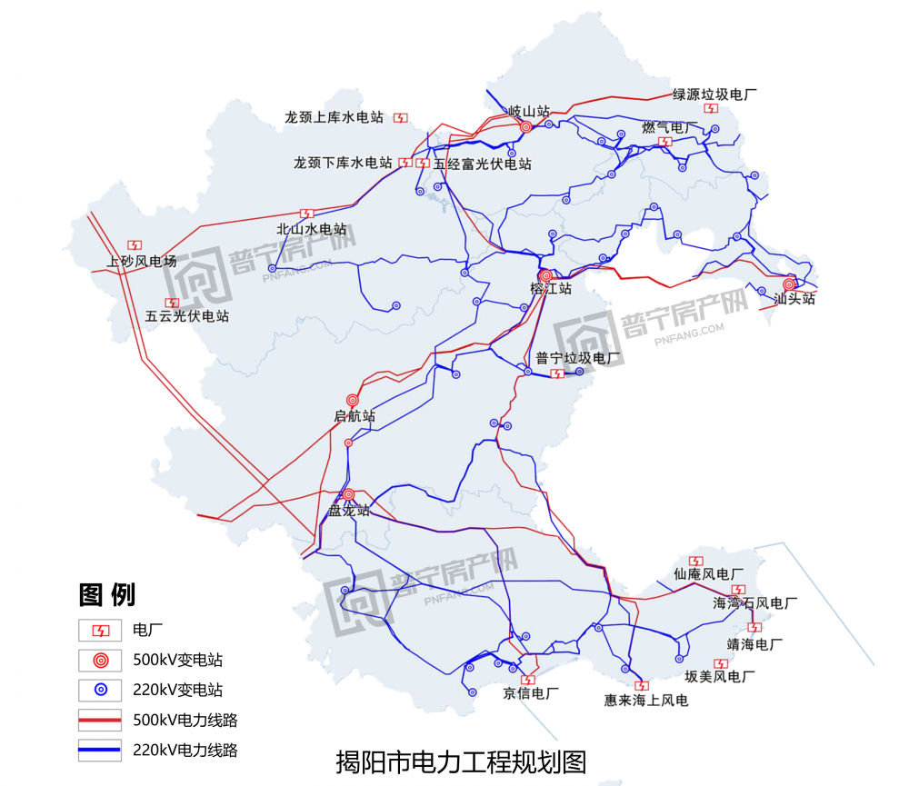 普宁的电力工程将设置普宁垃圾发电厂一处,以及一批220kv变电站。