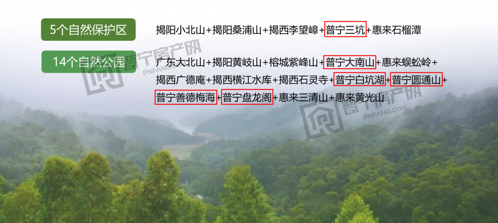 揭阳全市规划形成由5个自然保护区和14个自然公园构成的自然保护体系,严格保护重要生态空间,规划至2035年逐步建立自然保护体系。其中普宁三坑被规划成“5个自然保护区”之一;14个自然公园中,普宁的有:大南山(楼盘详情户型图相册地图)、白坑湖、圆通山、善德梅海、盘龙阁。