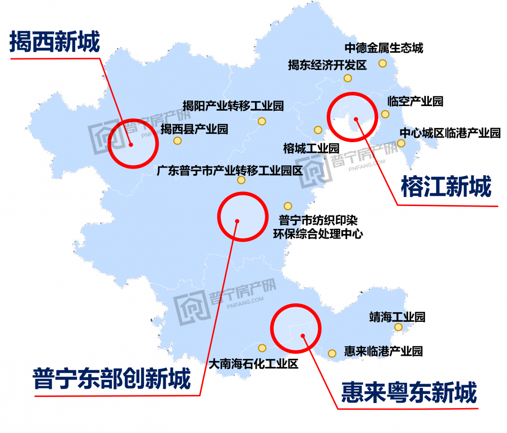 以产城互促平台打造现代产业集群,揭阳规划“4+12”产城互促平台,即4大新城和12大产业平台。其中: