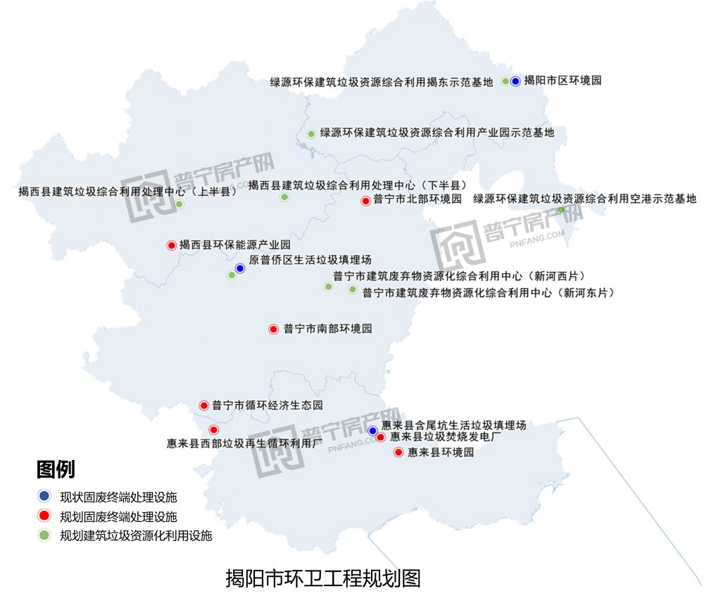 普宁现状固废终端处理设施有原普侨区生活垃圾填埋场,规划新增普宁市循环经济生态园、普宁市南部环境园、普宁市北部环境园三处“固废终端处理设施”,普宁市建筑废弃物资源化综合利用中心(新河西片)、普宁市建筑废弃物资源化综合利用中心(新河东片)两处“建筑垃圾资源化利用设施”。
