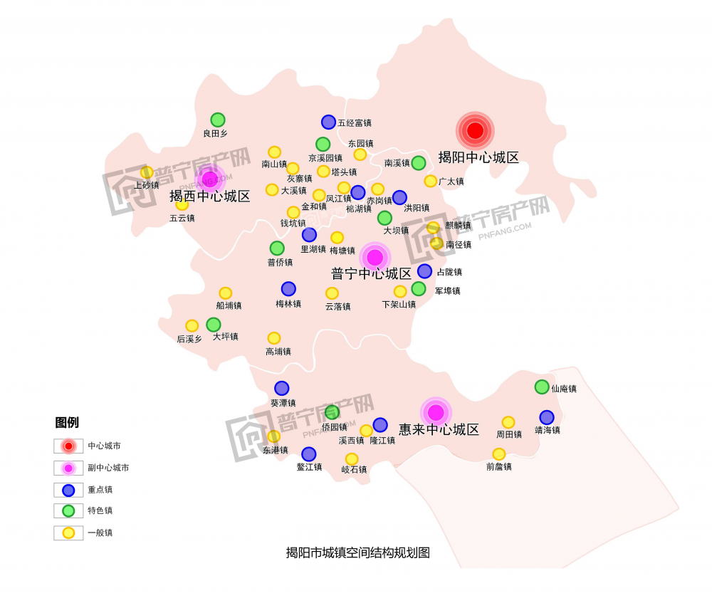 揭阳规划形成“中心城市一副中心城市一重点镇一特色镇一一般镇”五级城镇体系,引导产业和人口要素向中心城区集聚。其中: