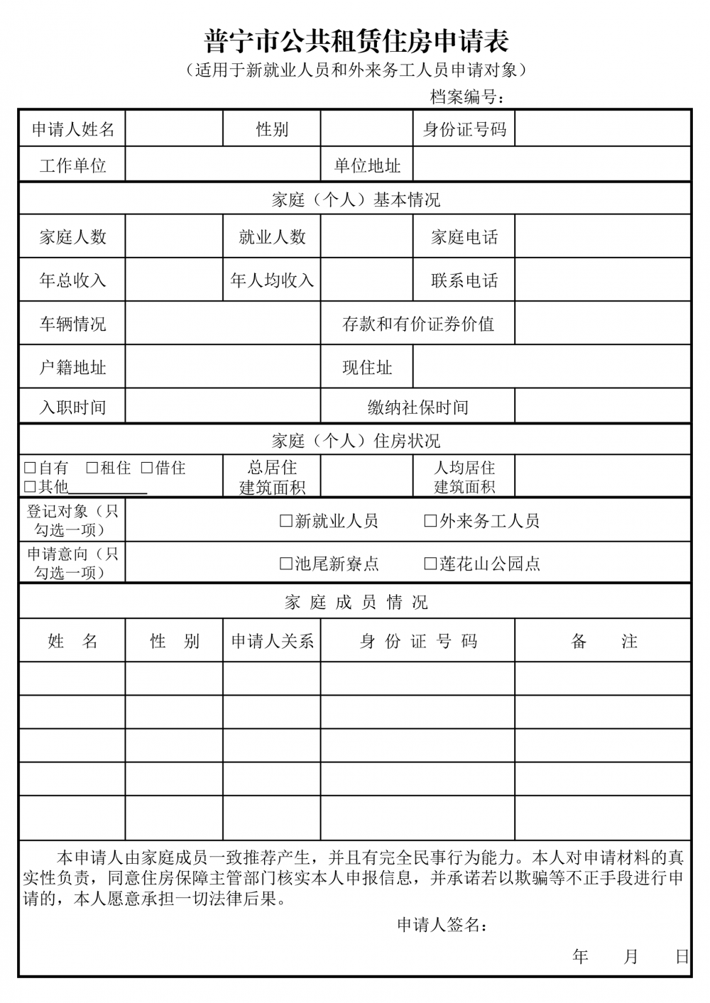 2.《普宁市公共租赁住房申请表》(适用于新就业人员和外来务工人员申请对象)