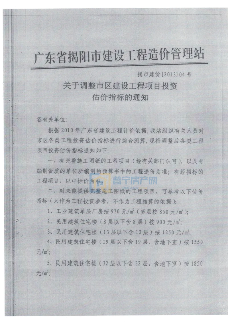 根据2010年广东省建设工程计价依据,我站组织有关人员对市区各类工程投资估价指标进行综合测算,现将调整后各类工程项目投资估价指标通知如下: