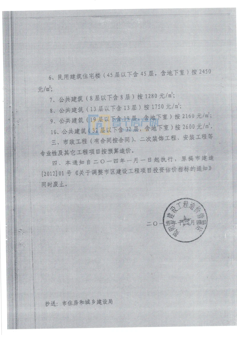 四、本通知自二0一四年一月一日起执行,原揭市建造[2012]01号《关于调整市区建设工程项目投资估价指标的通知》同时废止。