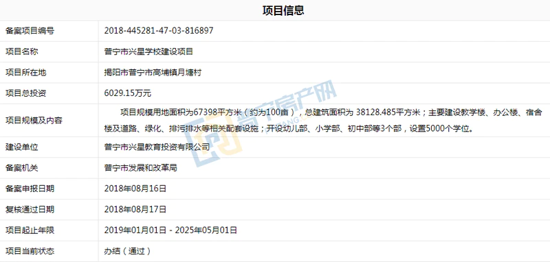 据小房君了解,本次规划的中小学地块为普宁市兴星学校建设项目,被列为《广东省2019年重点建设项目计划》,该校已于2018年备案通过。